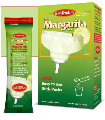 - Pour in the contents of 1 envelope of Bar-Tender's Instant Margarita Mix, shake well with ice