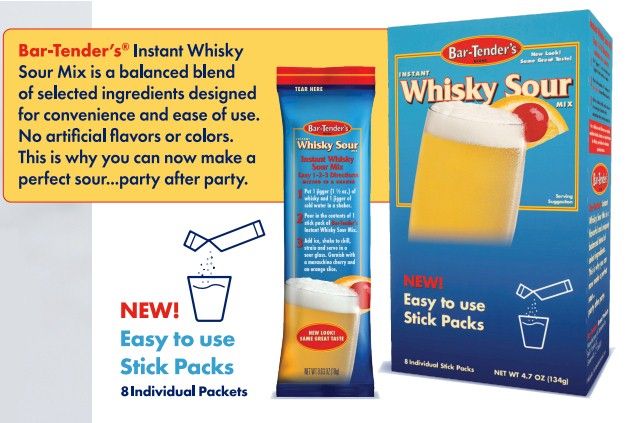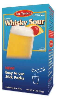 Bar Tender's instant whiskey sour mix is a balanced blend of selected ingredients - no artificial flavors or colors. This is why you can now make a perfect sour... party after party. "Made with the Bar-Tender's Touch". Non-Alcoholic. 8 Individual pouches in each box (16 Total).