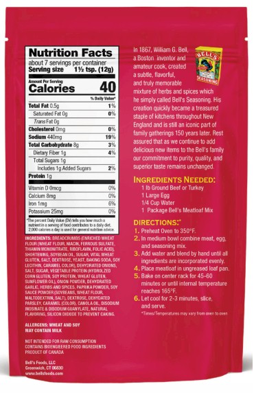 Perfect Meatloaf made easy! Bell’s Meatloaf Mix which has been a family favorite for over 40 years. This new, more flavorful recipe goes back to their roots and the original formula while delivering the quality you’ve come to expect from Bell’s. Made with genuine Bell's Seasoning.