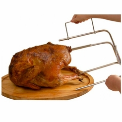 All the juices run into the breast. Cooks in the air - not in the fat. No basting required - browns evenly. 10-15% less cooking time. Use in oven or grill. High Quality 18/10 Stainless Steel. Will hold up to 25 lbs.